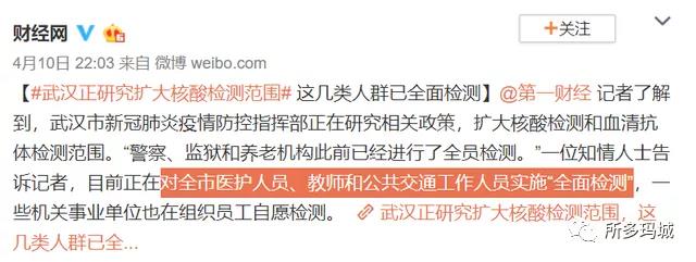 據(jù)@財(cái)經(jīng)網(wǎng) 報(bào)道,武漢市新冠肺炎疫情防控指揮部正在研究相關(guān)政策,擴(kuò)大核酸檢測(cè)和血清抗體檢測(cè)范圍。“警察、監(jiān)獄和養(yǎng)老機(jī)構(gòu)此前已經(jīng)進(jìn)行了全員檢測(cè)。”一位知情人士告訴記者,目前正在對(duì)全市醫(yī)護(hù)人員、教師和公共交通工作人員實(shí)施“全面檢測(cè)”,一些機(jī)關(guān)事業(yè)單位也在組織員工自愿檢測(cè)。