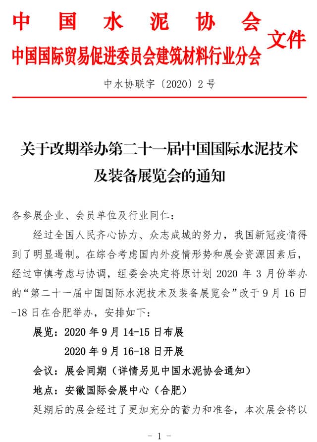 經過全國人民齊心協力、眾志成城的努力,我國新冠疫情得到了明顯遏制。在綜合考慮國內外疫情形勢和展會資源因素后,經過審慎考慮與協調,組委會決定將原計劃 2020 年 3 月份舉辦的“第二十一屆中國國際水泥技術及裝備展覽會”改于 9 月 16 日 -18 日在合肥舉辦,安排如下: