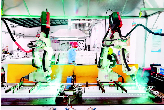 鋁合金模板作為一項新型模板技術,以其突出的生態環保和經濟優勢,取代了傳統竹木模板得到廣泛應用。圖為5月8日,遵義茍江經濟開發區一家企業的機器人在自動焊接標準化鋁模板。記者 李楓 攝