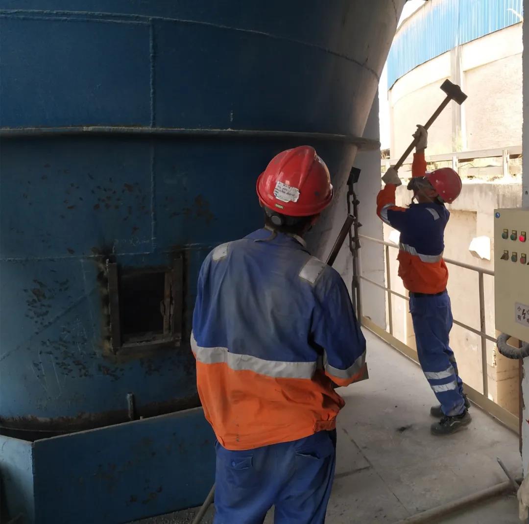 清庫前,大家制定好安全監管制度、應急預案,在作業現場認真做了風險評估,辦理作業許可,嚴格按照LOTOTO程序9步驟進行了操作,對庫外邊堆料區域進行警示隔離。由于清庫作業屬于高風險作業,為了降低風險,大家輪番作業,先使用大錘從庫錐鋼板倉外部進行敲擊,使用長鋼釬、架管從庫頂測量孔、下料口對庫壁物料進行清理,清除松動物料。然后系上安全帶站在梯子上,用風鎬對掛壁頑固的物料進行清理,庫內物料清下來后順著庫下邊的外接溜子輸送到外邊空地上。在清庫現場,大家充分發揚吃苦耐勞、精誠團結的工作作風,經過4天的共同努力,順利地完成了兩個庫的清料任務。生料系統清庫工作的順利完成,不僅讓大家積累了清庫作業經驗,同時為后期生產的穩定運行奠定了堅實基礎。