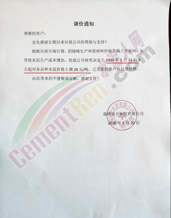 水泥人網(wǎng)通訊員消息:昨日(20日)淄博恒力水泥有限公司通知,根據(jù)目前市場行情,因錯峰生產(chǎn)和原材料價格大幅上升影響,導(dǎo)致水泥生產(chǎn)成本增加。經(jīng)公司研究決定于今日(5月21日)8時起對各品種水泥價格上調(diào)20元/噸。