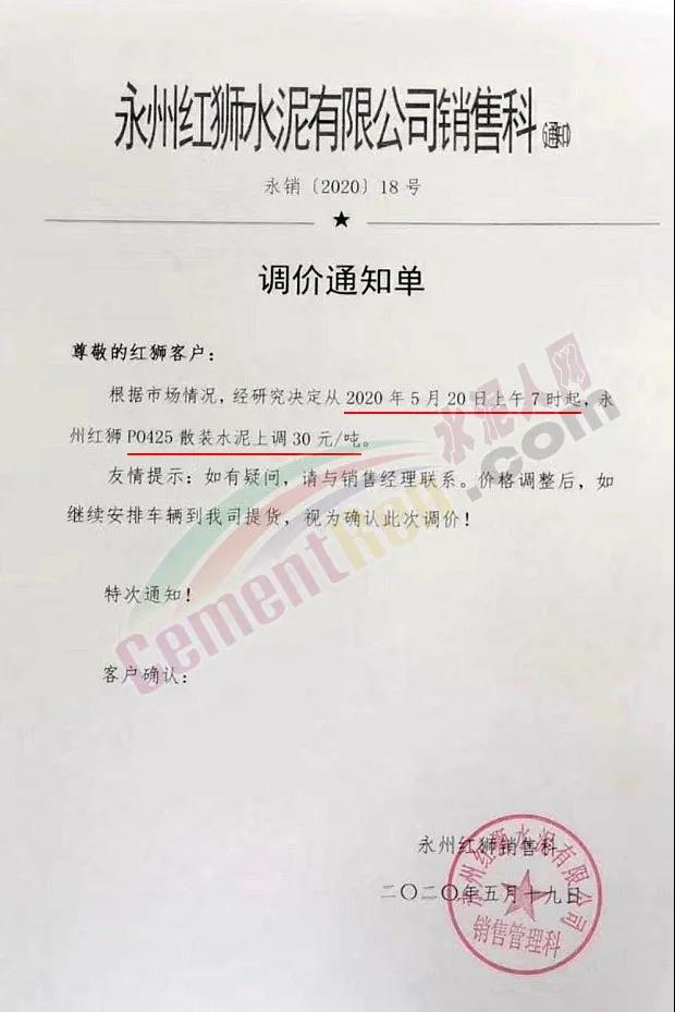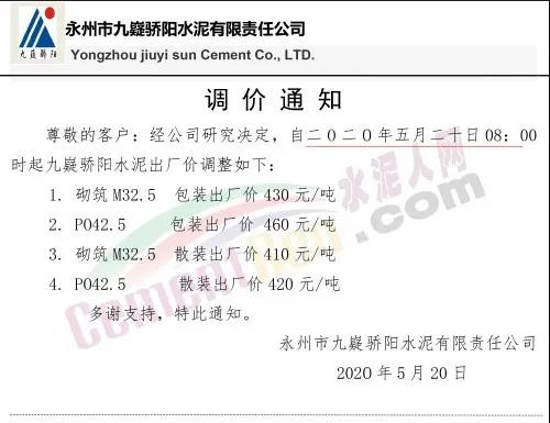 據(jù)水泥人網(wǎng)了解,近兩日,湖南區(qū)域多家企業(yè)也有通知上調(diào)水泥價格,20日湖南永州市九嶷驕陽水泥有限責(zé)任公司通知自5月20日8時起調(diào)整出廠價格。調(diào)整后各標(biāo)號水泥出廠價如下: