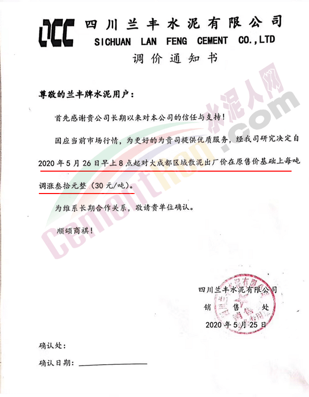 四川蘭豐水泥有限公司通知,自5月26日早8時起對大成都區域散裝水泥出廠價在原售價基礎上每噸上調30元。