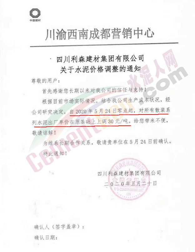 川渝西南成都營銷中心四川利森建材集團通知自5月24日零點起,所有散裝系列水泥出廠單價上調30元/噸。