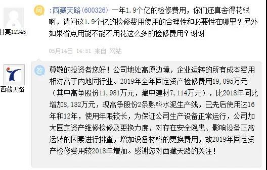 5月14日投資者也曾提問:“一年1.9個億的檢修費用,你們還真舍得花錢啊,請問這1.9個億的檢修費用使用的合理性和必要性在哪里?另外如果省點用能不能不用花這么多的檢修費用?”