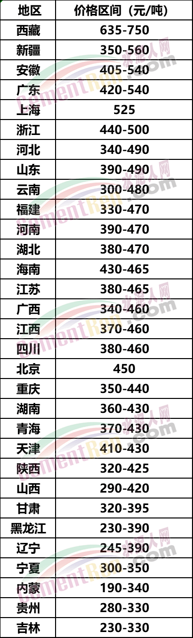 備注:以上水泥價格來源水泥人網e價格,僅供參考,如實際成交價不符,請以實際成交為準。
