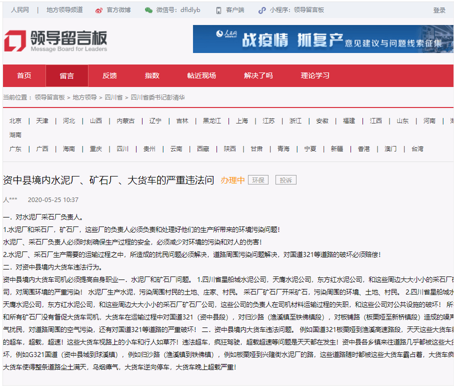 其留言稱,四川省星船城水泥公司、天鷹水泥公司、東方紅水泥公司以及周邊大大小小的采石廠礦石廠企業(yè)負(fù)責(zé)人在司機(jī)材料運(yùn)輸過程中嚴(yán)重失職,并且對(duì)公共設(shè)施的破壞!幾乎所有水泥廠和所有礦石廠沒有督促大貨車司機(jī),大貨車在運(yùn)輸過程中對(duì)國(guó)道321(資中縣段),對(duì)歸沙路(漁溪鎮(zhèn)至鐵佛鎮(zhèn)段),對(duì)板鋪路(板栗婭至新橋鎮(zhèn)段)造成的噪聲擾民、空氣擾民,對(duì)道路周圍的空氣污染,對(duì)國(guó)道321等道路的嚴(yán)重破壞!
