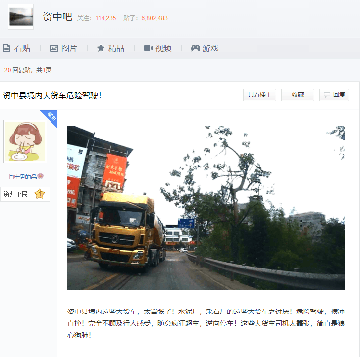 百度“資中吧”中一網(wǎng)友表示“資中縣境內(nèi)這些大貨車,太囂張了!水泥廠,采石廠的這些大貨車之討厭!危險(xiǎn)駕駛,橫沖直撞!完全不顧及行人感受,隨意瘋狂超車,逆向停車!這些大貨車司機(jī)太囂張,簡(jiǎn)直是狼心狗肺!”