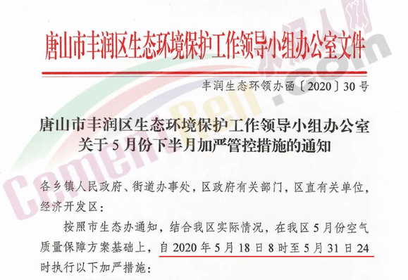 近期,河北、山東、河南、山西等區域通知開啟2020年夏季錯峰生產,同期,河北唐山豐潤區發布了《關于5月份下半月加嚴管控措施的通知》要求區域內水泥、混凝土攪拌站等企業即日起至5月31日執行加嚴措施。