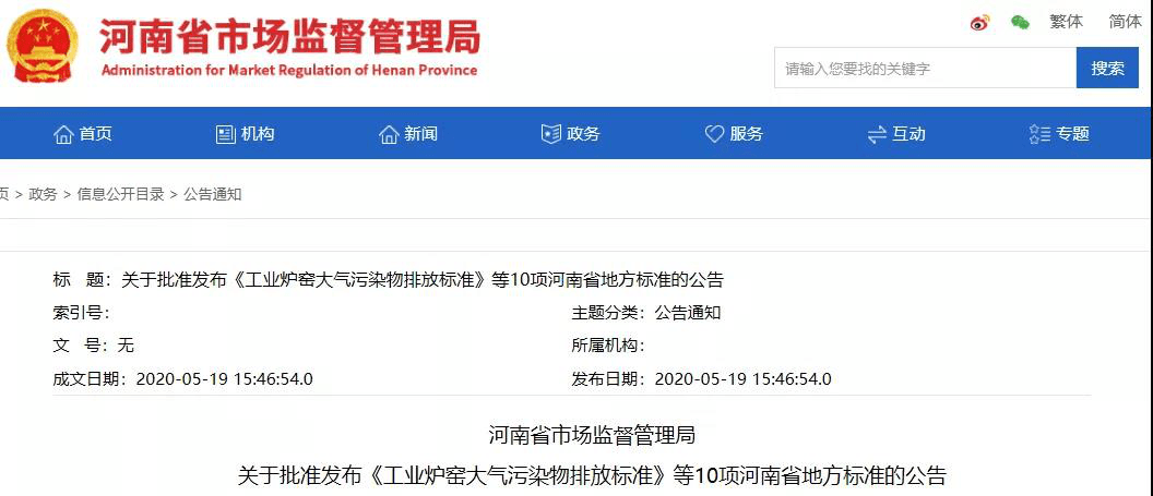 河南省市場監督管理局2020年29號公告批準發布新修訂的《工業爐窯大氣污染物排放標準》(DB41/1066-2020),自2020年6月1日起實施。