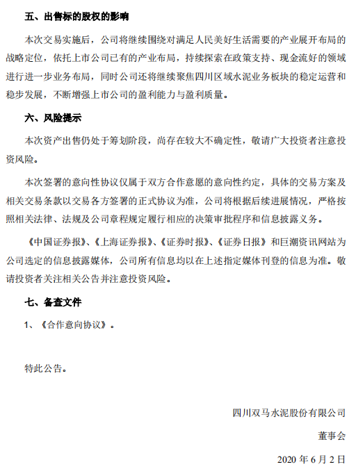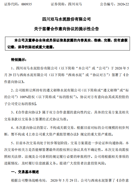公告特別提示稱:四川雙馬水泥股份有限公司已于 2020 年 5月 29 日與西南水泥有限公司簽署了《合作意向協議》。公司擬轉讓所持有的遵義礪鋒水泥有限公司100%股權 。
