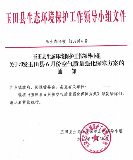 同期,唐山市玉田縣生態環境保護工作領導小組了發布了6月份空氣質量強化保障方案。