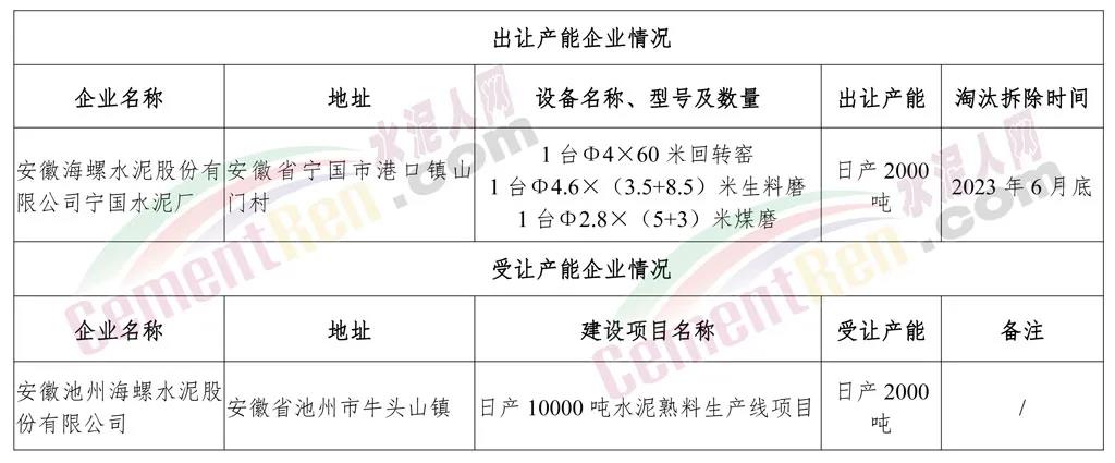 產能出讓情況表顯示,位于安徽省寧國市港口鎮山門村的安徽海螺水泥股份有限公司寧國水泥廠將出讓2000t/d熟料生產線(于2023年6月底前淘汰拆除)給位于安徽省池州市牛頭山鎮的池州海螺水泥新建日產10000噸水泥熟料生產線,受讓產能為2000t/d。同期有消息稱,前期江蘇省公示的中國水泥廠退出產能也將用于新建池州海螺水泥萬噸線項目。6月1日,江蘇省工信廳發布《關于中國水泥廠有限公司產能確認的公告》將中國水泥廠共210萬噸/年產能置換出讓。