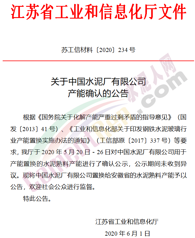 6月2日宣城市人民政策發布《關于安徽海螺水泥股份有限公司寧國水泥廠日產2000噸水泥孰料生產線產能出讓的公告》稱,根據《國務院關于化解產能嚴重過剩矛盾的指導意見》(國發〔2013〕41號)和《工業和信息化部關于印發鋼鐵水泥玻璃行業產能置換實施辦法的通知》(工信部原〔2017〕337號)等文件要求,現將安徽海螺水泥股份有限公司寧國水泥廠2000噸/日水泥孰料生產線產能跨市出讓情況予以公告,歡迎社會公眾進行監督,公告期:2020年6月2日- 6月8日。