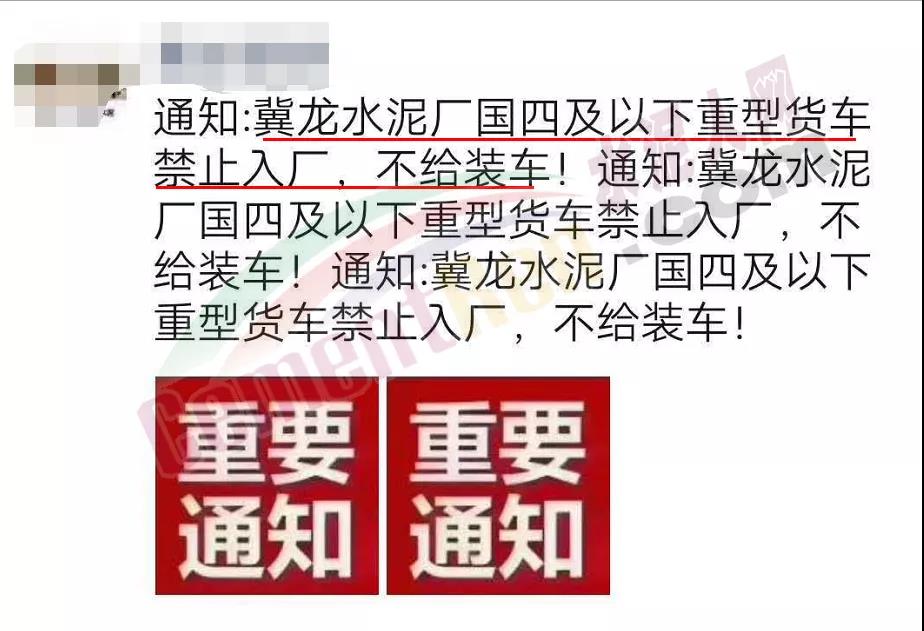應上述要求,冀龍水泥廠通知,國四及以下重型貨車禁止入廠,不給裝車。