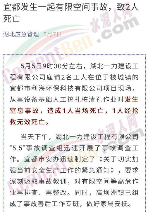湖北省應急管理廳官方微信發布消息:2020年5月5日9時30分左右,湖北一力建設工程有限公司雇請2名工人在位于枝城鎮的宜都市利海環??萍加邢薰卷椖楷F場,從事設備基礎人工挖孔樁清孔作業時發生窒息事故,造成1人當場死亡,1人經搶救無效死亡。