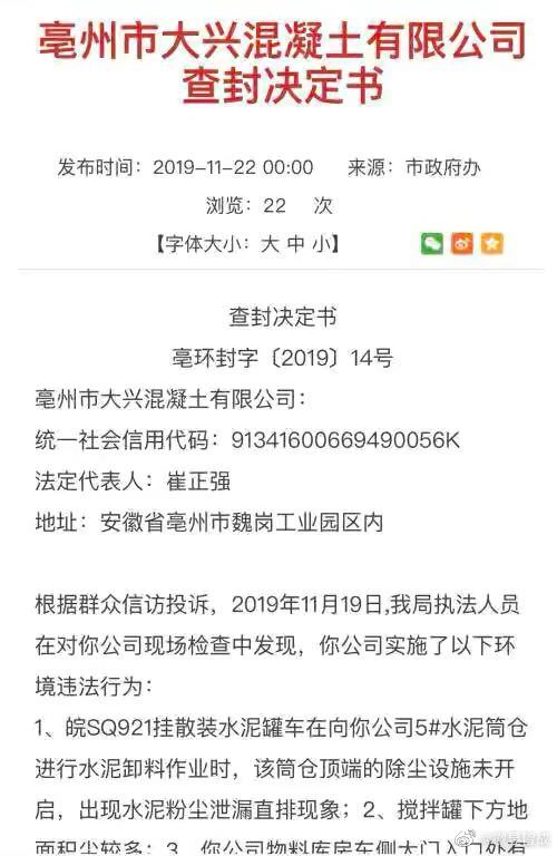 2019年11月22日,亳州市生態環境局經過調查核實,認為,該公司以上行為違反了《中華人民共和國大氣污染防治法》第四十八條之規定。依據《中華人民共和國大氣污染防治法》第三十條規定,決定對鈣公司排放大氣污染物的設施、設備實施現場查封。隨后下達了查封決定書(亳環封字〔2019〕14號)。