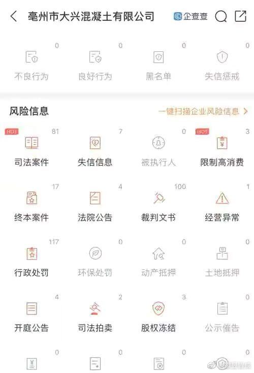 企查查提示:亳州市大興混凝土有限公司法人代表為崔正強,該公司因為違反大氣污染防治管理制度和機動車違反禁令標志等違法違規行為,曾被行政處罰高達117次。