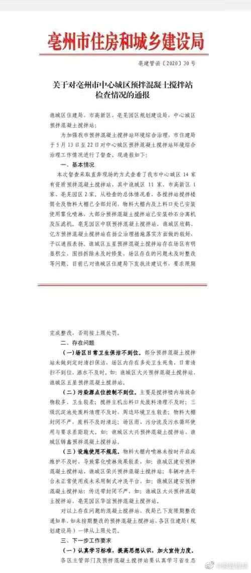 2020年5月22日,亳州市住建局經過檢查核實,對中心城區混凝土攪拌站下達(亳建管函2020第30號)檢查情況通告。