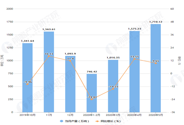 據(jù)國家統(tǒng)計局統(tǒng)計數(shù)據(jù)顯示,2020年3月山東省水泥產(chǎn)量為1016.35萬噸,同比下降14.23%,2020年4月山東省水泥產(chǎn)量為1575.23萬噸,同比增長13.55%,2020年5月山東省水泥產(chǎn)量為1710.12萬噸,同比增長9.65%,2020年5月前山東省水泥產(chǎn)量不斷下降。