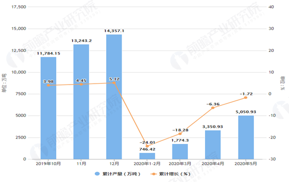 2020年5月前山東省水泥產(chǎn)量及增長情況圖