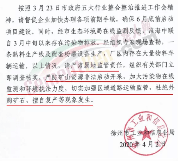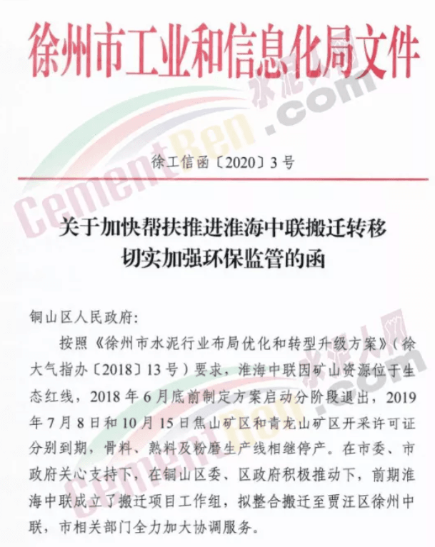 今年3月份,徐州市工信局為了進一步敦促淮海中聯水泥盡快退出,發布了《關于加快幫扶推薦淮海中聯搬遷轉移切實加強環保監管的函》稱,要求相關部門嚴肅屬地監管責任,組織有關部門立即調查,嚴防礦山資源非法啟動開采,加大污染物在線監測和環境執法力度,切實加強區域道路運輸監管,杜絕外購礦石、擅自復產等現象。
