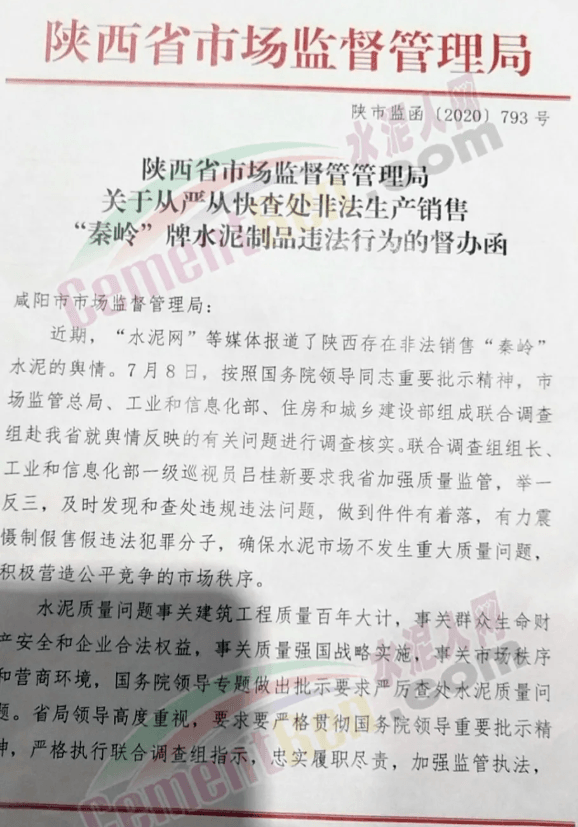 針對聯(lián)合督查組提出的要求,陜西省市場監(jiān)管局于7月10日下發(fā)《關(guān)于從嚴從快查處非法生產(chǎn)銷售“秦嶺”牌水泥制品違法行為的督辦函》給轄區(qū)咸陽市市場監(jiān)管局要求對轄區(qū)內(nèi)相關(guān)企業(yè)進行重點督查。