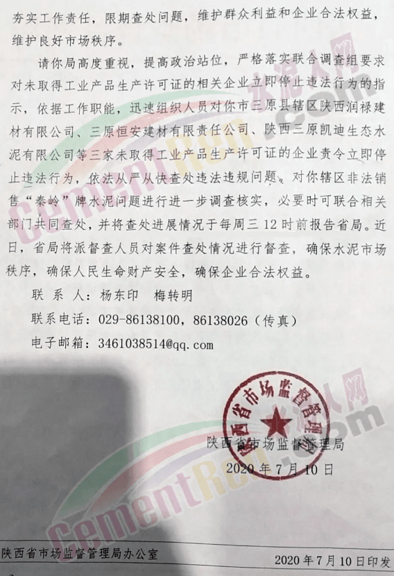 并要求咸陽市場監(jiān)管局高度重視,提高政治站位,嚴格落實聯(lián)合調(diào)查組要求對未取得工業(yè)產(chǎn)品生產(chǎn)許可證的相關(guān)企業(yè)立即停止違法行為的指示,依據(jù)工作職能,迅速組織人員對咸陽市三原縣轄區(qū)陜西潤祿建材有限公司、三原恒安建材有限責任公司、陜西三原凱迪生態(tài)水泥有限公司三家未以得工業(yè)產(chǎn)品生產(chǎn)許可證的企業(yè)責令立即停止違法行為。依法從嚴從快查處違法違規(guī)問題,對轄區(qū)非法銷售“秦嶺”牌水泥問題進行進一步調(diào)查核實 ,必要時可聯(lián)合相關(guān)部門共同查處。并將查處進展情形況于每周三12時前報告省局。