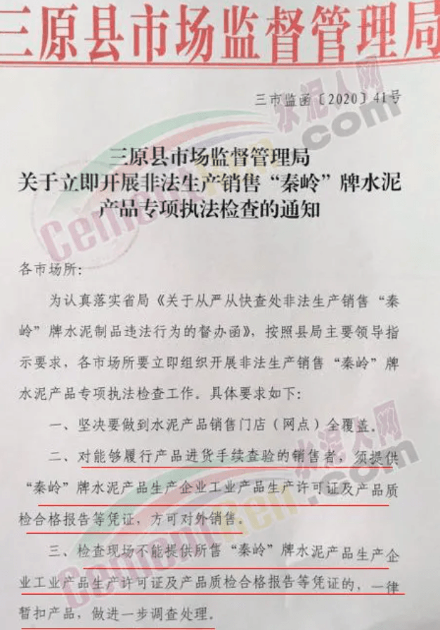 同期,陜西咸陽市三原縣市場監(jiān)督管理局發(fā)布《關(guān)于立即開展非法生產(chǎn)銷售“秦嶺 ”牌水泥產(chǎn)品專項執(zhí)法檢查的通知》稱,為認真落實省局《關(guān)于從嚴從快查處非法生產(chǎn)銷售“秦嶺”牌水泥制品違法行為的督辦函》按照縣局主要領(lǐng)導指示要求,各市場 所要立即組織開展非法生產(chǎn)銷售“秦嶺”牌水泥產(chǎn)品專項執(zhí)法檢查工作。具體要求為: