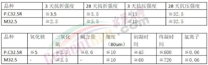 P.C32.5R標號水泥和M32.5標號水泥的主要指標對比如下: