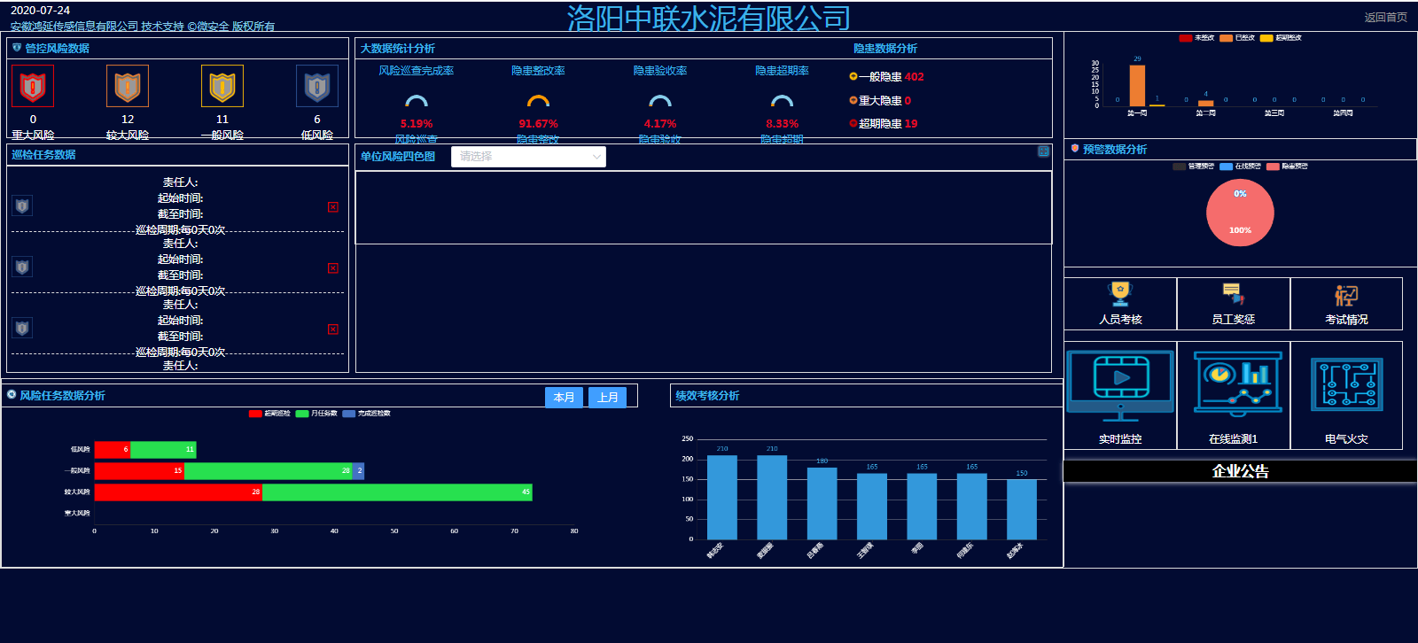 洛陽中聯自建廠以來,高度重視安全工作,先后投入大量的資金和人力,不斷完善公司的安全生產管理體系。2018年7月份以來,隨著《河南省安全生產監督管理局關于開展我省工貿行業企業安全風險評估診斷分級的通知》和《河南省企業風險分級管控隱患排查治理雙重預防指導手冊》兩份文件的先后下發,洛陽中聯積極響應上級指示精神,開始于2019年3月份,依托公司的智能化平臺,正式著手構建洛陽中聯信息化雙重預防機制。