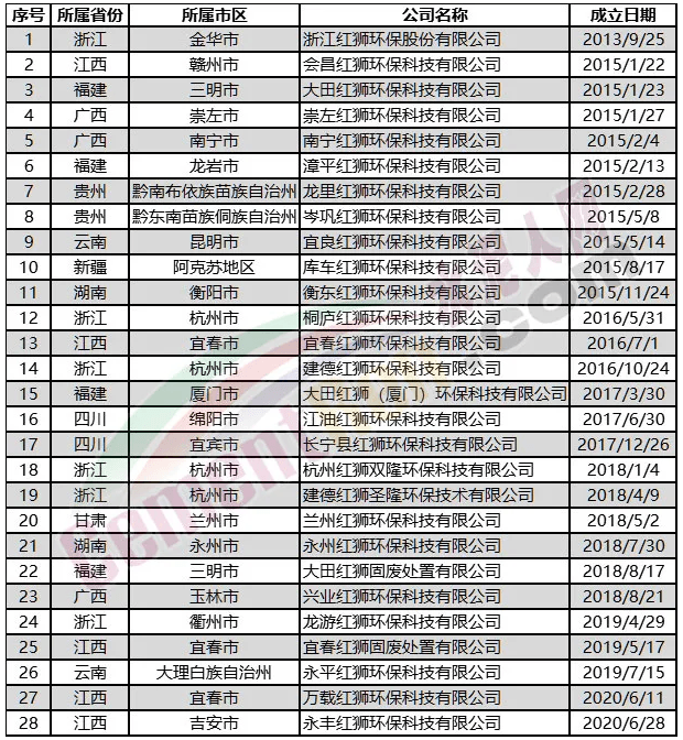 近年來,紅獅水泥一面繼續深耕水泥產業,一面打造水泥“生態圈”,架構以水泥窯協同處置固廢為主的環保產業。紅獅水泥集團董事長、總經理章小華年初在2020年經營工作會議上發表講話時曾表示, 2019年紅獅集團經營工作取得較好成績全年銷售水泥和商品熟料首次突破1億噸、同比增長14.3%,同時水泥“生態圈”發展勢頭良好;章總強調,紅獅發展戰略是“立足水泥主業,打造水泥‘生態圈’,做好資產配置”,水泥是主業和基礎,“生態圈”圍繞水泥主業。據查詢,從2013年9月下旬開始紅獅集團陸續在10余省市地區注冊成立了近30家環保科技公司。