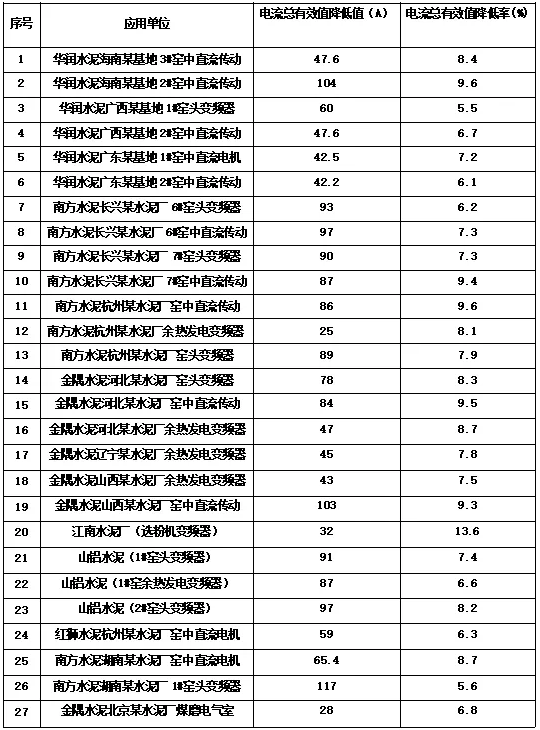 從各大水泥企業的應用情況來看,應用諧波動態治理技術(DTXB)后,諧波電流吸收率大于50%,電流總有效值降低率大于5%,取得了非常不錯的治理成績,得到了各水泥集團的高度認可。