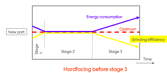 (四) 修復過程及檢測:在保證有效的前處理情況下,必須進行堆焊過程控制,其實也是通過工藝參數的細化,來控制熱輸入/線能量來達到理想的狀態。參數控制包括:焊接電流,電壓,堆焊線速度,層間溫度等。目測主要是觀察電弧的穩定性,飛濺的大小,焊縫成型,裂紋形式等;過程控制包括相對應的樣板測試,尺寸隨檢等。隨后,在使用過程中,為了更有效的提高使用壽命,同時提請注意入料粒度,料層厚度等,這樣在保證粉磨質量的同時提高產量。