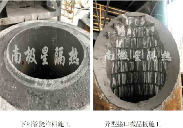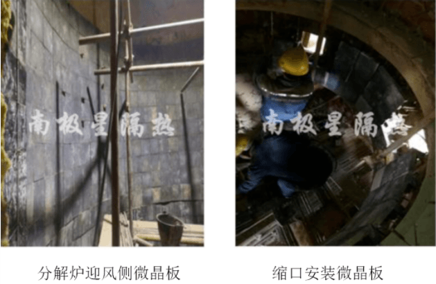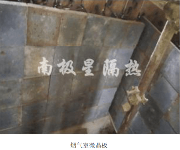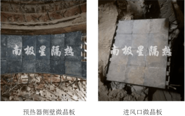 ZAS1550型微晶板在容易結皮的預熱器、分解爐三次風管的迎風面、縮口、錐體、煙氣室和下料管上大量應用,為水泥企業解決結皮堵塞問題創造了條件。同時,在冷面配套使用南極星NJS950型納米隔熱板,大幅度地降低了設備的外殼溫度,為燒成系統節約能耗提供了保證。
