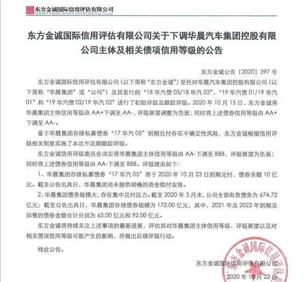 大公表示,按照2017年9月華晨集團與債權投資計劃受托人太平資產(chǎn)管理有限公司簽署的《太平一一華晨汽車制造產(chǎn)業(yè)升級債權投資計劃投資合同》約定,華晨集團應于2020年9月21日劃撥季度應付利息。截至2020年10月14日,華晨集團仍未將應付季度利息劃撥至債權投資計劃托管人賬戶。而東方金誠很罕見的在債券違約當天就掛出了評級下調(diào)公告,華晨集團的主體信用評級再一次斷崖式下跌至BBB。