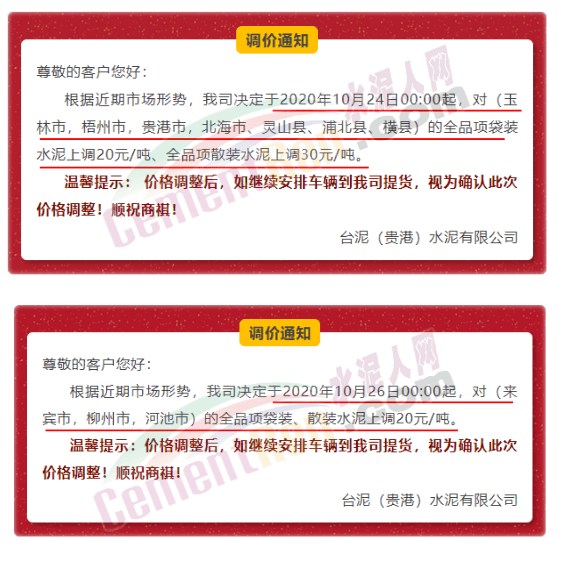 臺(tái)泥(貴港)水泥有限公司通知于2020年10月24日00:00起,對(duì)(玉林市,梧州市,貴港市,北海市、靈山縣、浦北縣、橫縣)的全品項(xiàng)袋裝水泥上調(diào)20元/噸、全品項(xiàng)散裝水泥上調(diào)30元/噸;于2020年10月26日00:00起,對(duì)(來賓市,柳州市,河池市)的全品項(xiàng)袋裝、散裝水泥上調(diào)20元/噸。