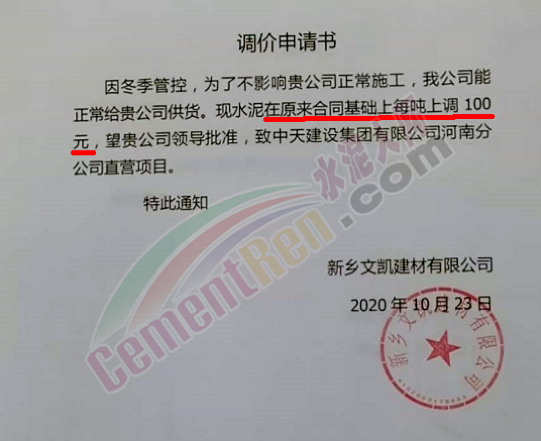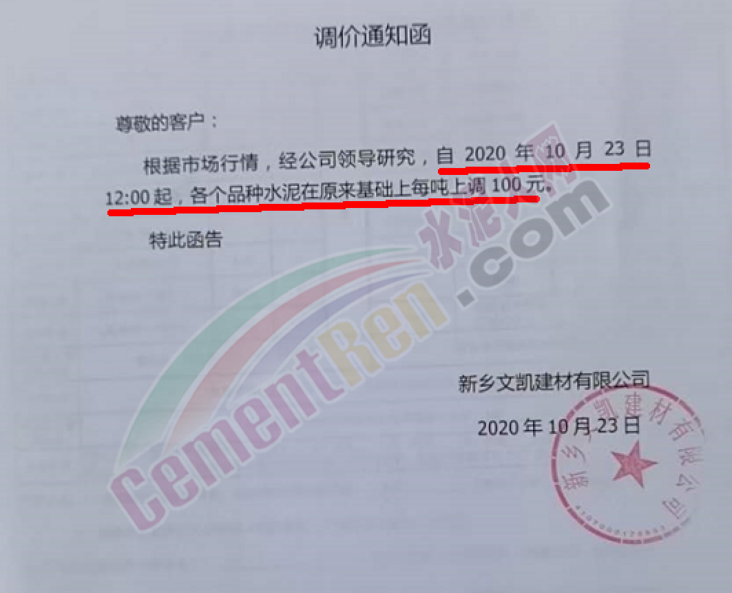 水泥人網通訊員消息,因重污染天氣臨停影響,河南多區域水泥企業通知價格上調,10月22日~23日鄭州、新鄉、許昌、駐馬店、安陽、禹州、登封等地陸續通知上調高標水泥價格30元/噸。目前區域內多數熟料線停窯檢修,管控加強后,水泥生產受限,庫存下滑,周邊區域有意陸續跟進上調。新鄉區域水泥經銷企業新鄉凱文建材有限公司通知因冬季管控,水泥在原合同基礎上每噸上調100元。