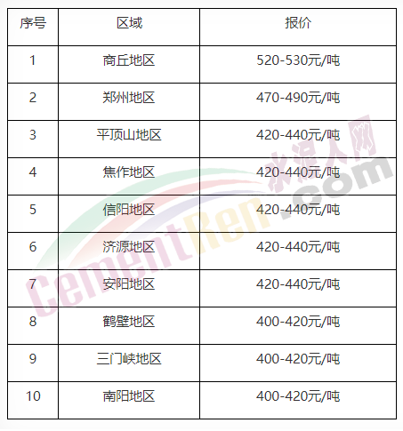 河南部分區域PO42.5散裝水泥出廠報價如下: