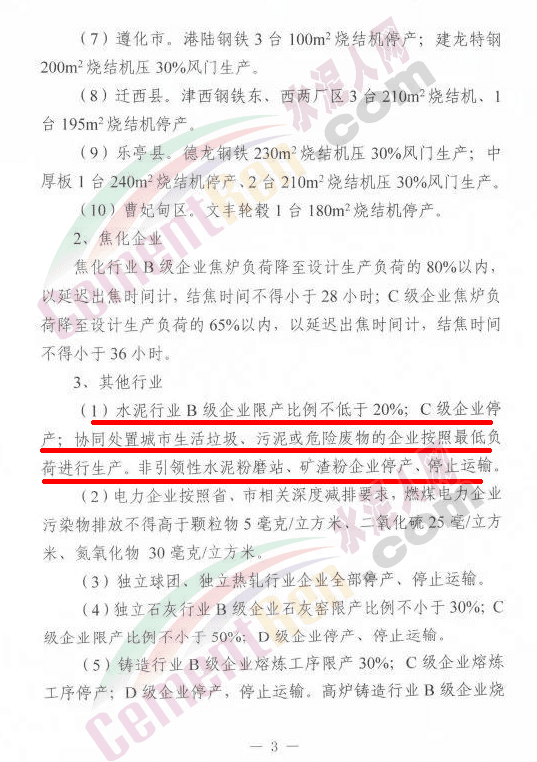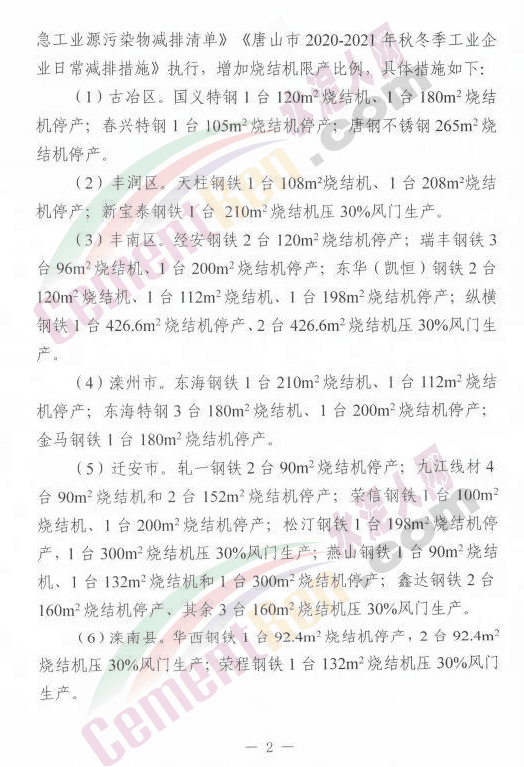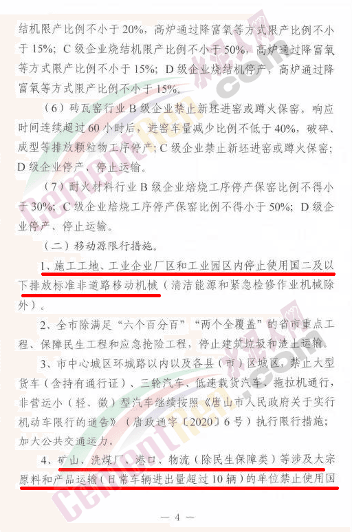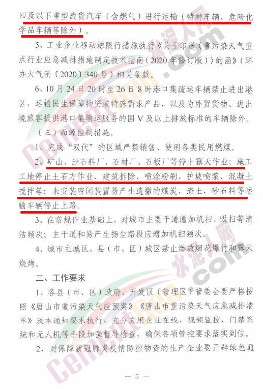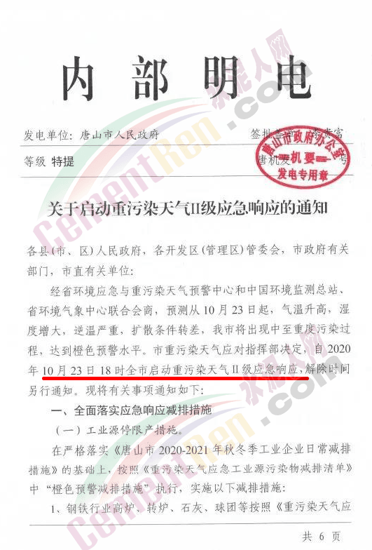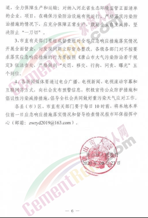 日前,唐山市人民政府發布特提等級文件《關于啟動重污染天氣II級應急響應的通知》稱,自2020年10月23日18時全市啟動重污染天氣II級應急響應,解除時間另行通知。工業源停限產措施,要求在嚴格落實《唐山市2020-2021年秋冬季工業企業日常減排措施》的基礎上,按照《重污染天氣應急工業源污染物減排清單》中“橙色預警減排措施”執行。水泥行業B級企業限產比例不低于20%;C級企業停產;協同處置城市生活垃圾、污泥或危險廢物的企業按照最低負荷進行生產。非引領性水泥粉磨站、礦渣粉企業停產、停止運輸。施工工地、工業企業廠區和工業園區內停止使用國二及以下排放標準非道路移動機械(清潔能源和緊急檢修作業機械除外)。 全市除滿足“六個百分百”“兩個全覆蓋”的省市重點工程、保障民生工程和應急搶險工程,停止建筑垃圾和渣土運輸。礦山、洗煤廠、港口、物流(除民生保障類)等涉及大宗原料和產品運輸(日常車輛進出量超過10輛)的單位禁止使用國四及以下重型載貨汽車(含燃氣)進行運輸(特種車輛、危險化學品車輛等除外)。工業企業移動源限行措施執行《關于印送〈重污染天氣重點行業應急減排措施制定技術指南(2020年修訂版)〉的函》(環辦大氣函〔2020〕340號)相關條款。10月24日20時至26日8時港口集疏運車輛禁止進出港區,運輸民生保障物資或特殊需求產品、以及為外貿貨物、進出境旅客提供港口集輸運服務的國V及以上排放標準的車輛除外。礦山、沙石料廠、石材廠、石板廠等停止露天作業;施工工地停止土石方作業、建筑拆除、噴涂粉刷、護坡噴漿、混凝土攪拌等;未安裝密閉裝置易產生遺撒的煤炭、渣土、砂石料等運輸車輛停止上路。各縣(市、區)政府、開發區(管理區)管委會充分應用企業在線、現頻監控、門票系統和無人機等手段加強督導檢查,確保各項管控要求落實到位。市直有關部門要爼成督查組對全市應急響應措施落實情況開展全面督查,對發現問題立即督辦整改。各級各部門對不按要求落實應急響應措施的行為要按照《唐山市大氣污染防治若干規定》依法查處,嚴格做到“處罰、移交、行拘、問責、曝光”五個到位。文件原文如下:
