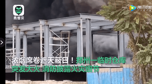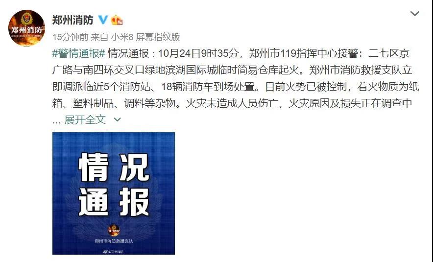 隨后,鄭州消防發布情況通報稱,10月24日9時35分,鄭州市119指揮中心接警:二七區京廣路與南四環交叉口綠地濱湖國際城臨時簡易倉庫起火。鄭州市消防救援支隊立即調派臨近5個消防站、18輛消防車到場處置。目前火勢已被控制,著火物質為紙箱、塑料制品、調料等雜物。火災未造成人員傷亡,火災原因及損失正在調查中。