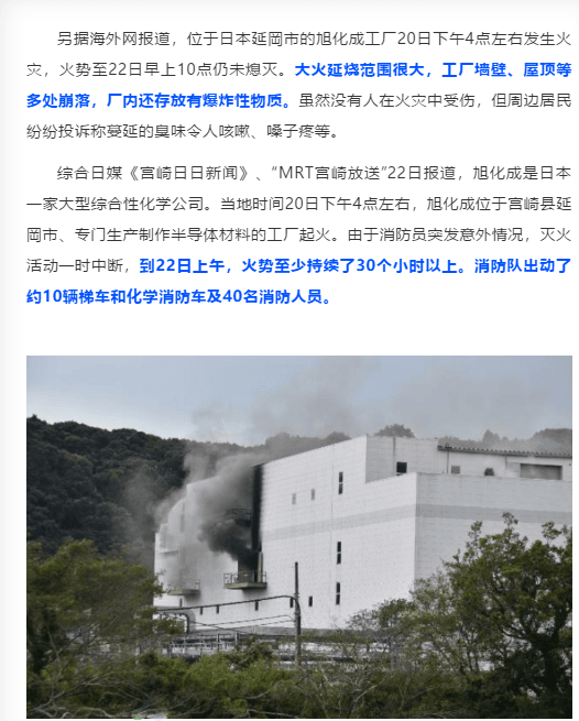 這家工廠負責生產旭化成公司用于音響器械、家電產品等的半導體設備。起火地點位于工廠4層。22日上午,工廠5層的房頂和西側墻壁全部崩塌起火。目前沒有人在火災中受傷,但工廠周邊持續蔓延著異臭和黑煙。住在附近的不少居民稱嗓子疼、咳嗽等,并紛紛投訴稱“臭味無法忍受”“幾乎吃不了飯”。旭化成方面回應稱,工廠內的電線是鹽化塑料材質,燃燒后會產生氣味,“并未達到會對人體產生影響的濃度”。日媒稱,工廠內還存有爆炸性物質甲硅烷。這是一種無色氣體,遇到空氣可能發生小規模爆炸性自燃。但旭化成公司稱,不會對工廠外部造成危險。22日白天,約70名消防人員在現場進行滅火工作。