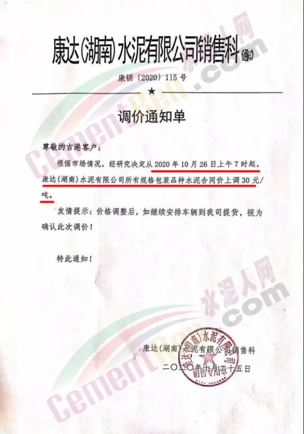 紅獅水泥旗下康達(湖南)水泥有限公司銷售科通知,自10月26日上午7時起,所有規格包裝品種水泥合同價上調30元/噸。