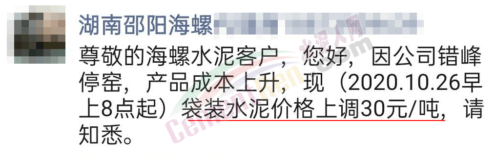 邵陽海螺通知,因公司錯峰停窯,產品成本上升,自10月26日早8點起袋裝水泥價格上調30元/噸。