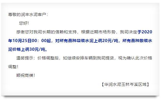 華新水泥(郴州)有限公司通知,自10月25日18時起對所有包裝供貨產品價格上調30元/噸。