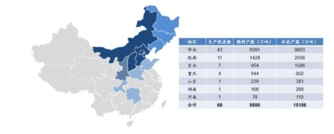 產能主要布局在京津冀、陜西、山西、內蒙、東北、重慶、山東、河南和湖南地區, 共計 13 個省/直轄市, 其中華北區域為公司產能主要區域,熟料產能占公司整體產能的 64%, 其中核心區域京津冀地區占總體比重約 46%,其次為陜西和東北區域,分別占比為 15%和 10%。