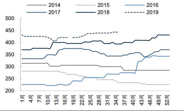 下圖是近六年華北地區同期水泥價格,可以看出2019年是近六年最高的一年。期高位水平。