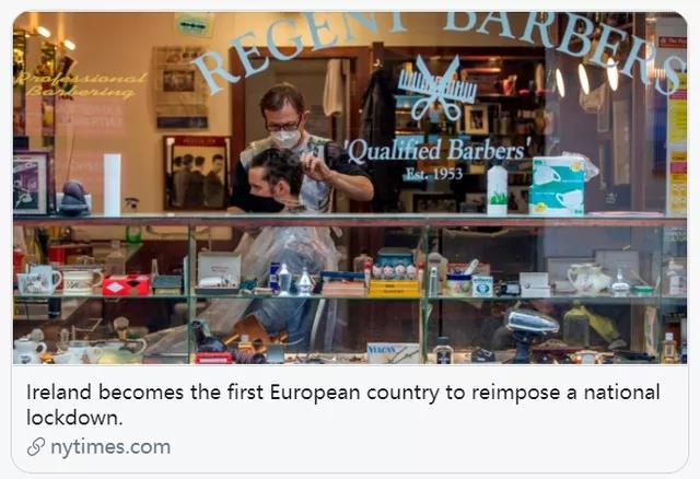 愛爾蘭總理米歇爾·馬丁20日宣布,自10月22日起再度全國“封城”6周,直到12月初。非必要經營場所一律關閉,超市、藥房、郵局和銀行等不受影響。餐館、咖啡館和酒吧僅限外賣服務。民眾外出活動范圍僅限住所5公里范圍內。