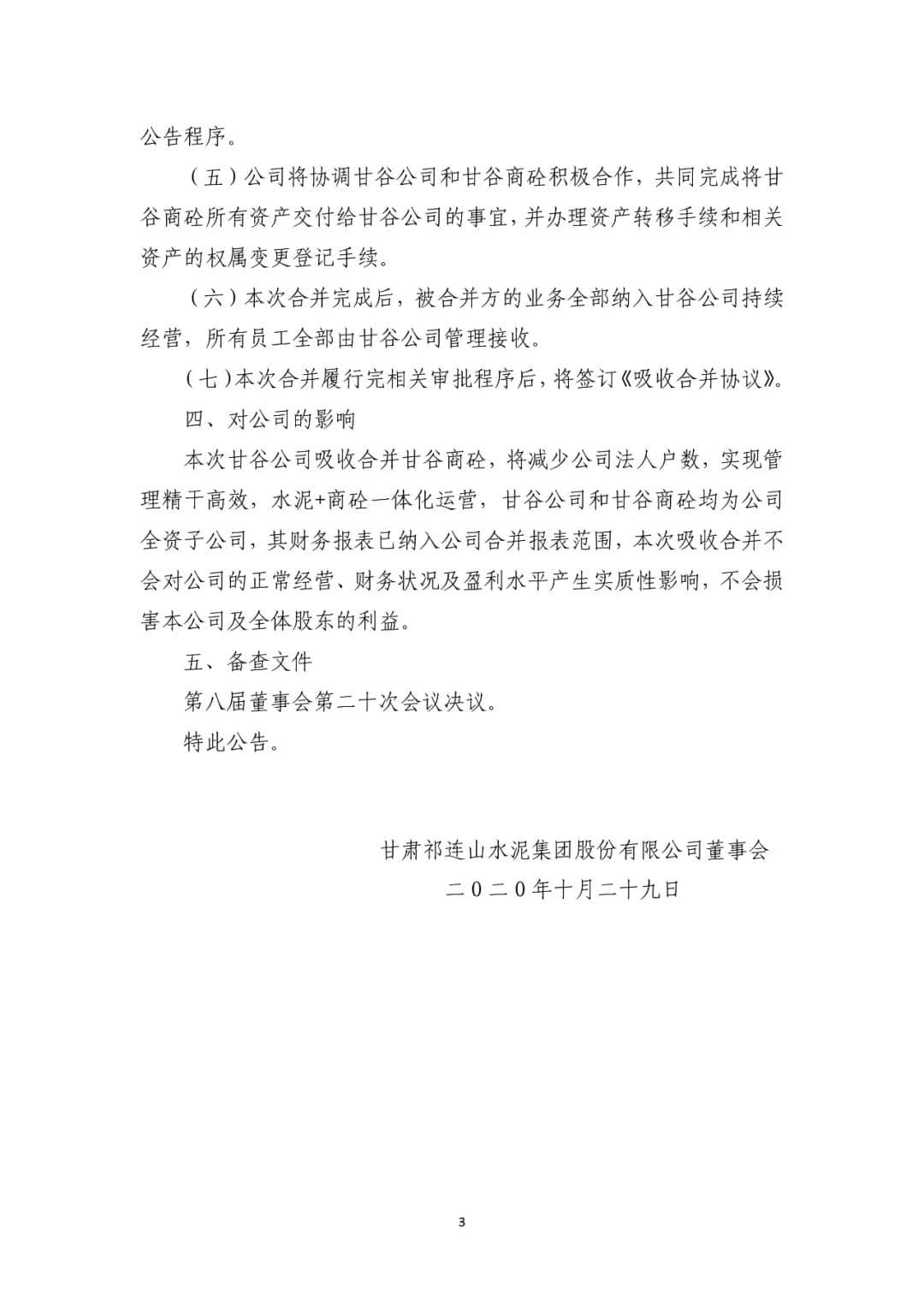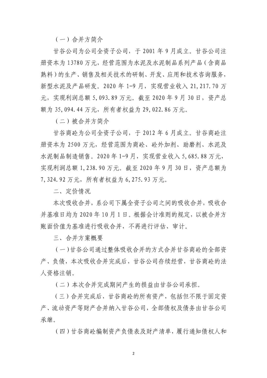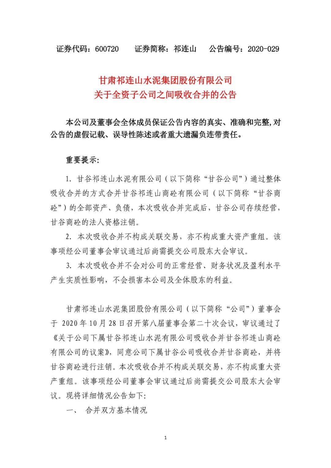 日前,上市公司祁連山發(fā)布公告稱,全資子公司甘谷祁連山水泥有限公司通過整體吸收合并的方式合并甘谷祁連山商砼有限公司的全部資產(chǎn)、負債,本次吸收合并完成后,甘谷公司存續(xù)經(jīng)營,甘谷商砼的法人資格注銷。公告原文如下: