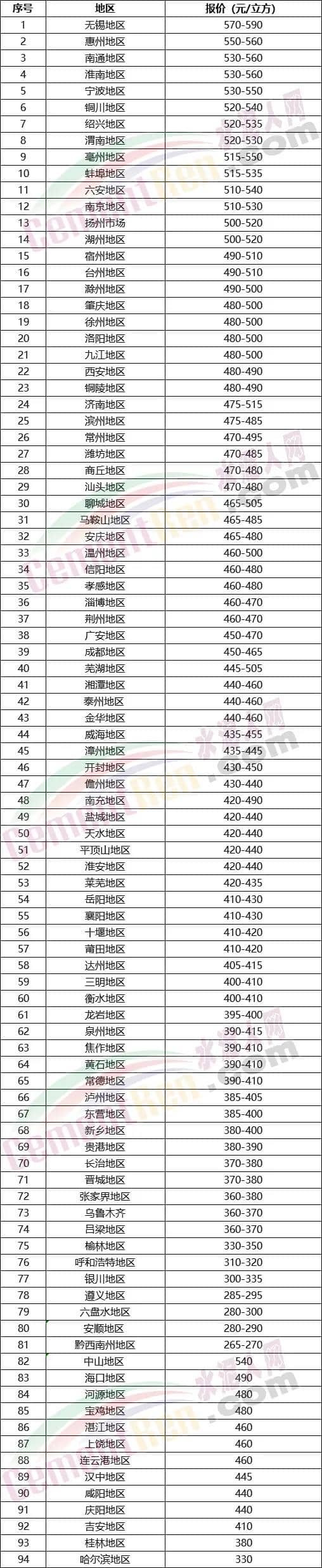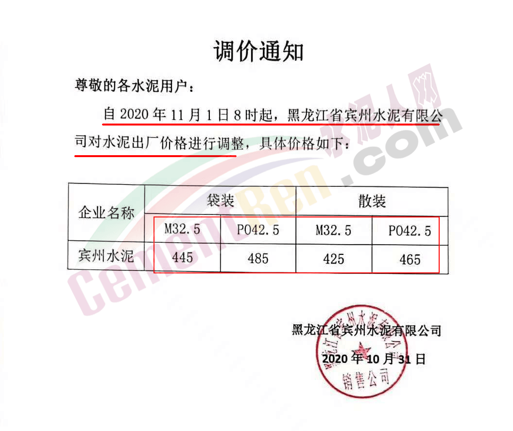 同日,黑龍江賓州水泥有限公司也通知自今日(11月1日)8時(shí)起,對(duì)水泥出廠價(jià)格進(jìn)行調(diào)整,調(diào)整后M32.5袋裝水泥執(zhí)行445元/噸,PO42.5水泥執(zhí)行485元/噸,M32.5散裝水泥執(zhí)行425元/噸,PO42.5散裝執(zhí)行465元/噸。